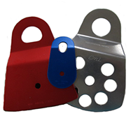 Sideplates and Beckets: Sideplates form the body of the pulley, and together with the axle are primarily responsible for its strength. Beckets are installed in multi- sheave pulleys to provide a lower tie-in point. Most pulleys have sideplates that rotate independently around the axle to make rigging easier. This allows the pulley to be rigged onto a rope mid-strand, rather than only at the ends. Sideplates come in all shapes, sizes and colors depending on pulley function. Anodized Aluminum (AA) is lightweight and durable, but not as strong. Stainless Steel (SS) is very strong and resistant to the elements, but heavy.